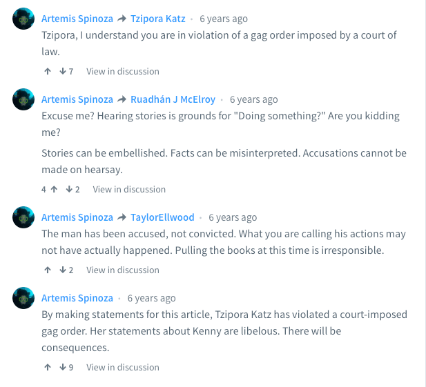 After Tzipora Katz left Kenny Klein in 1992, Kayla Serotte (Artemis Spinoza) was one of the many members who believed Klein when he denied abusing Tzipora or molesting his son and step-daughter. In 1997 Klein sued for custody of his son. In exchange for Klein dropping his claim, a financially pressed Katz agreed to refrain from making public her accusations. Katz and her children distanced themselves from the Pagan community and from the Blue Star Coven she and Klein had co-founded. Those who joined Blue Star afterwards were assured those stories were just rantings from a bitter ex-wife, if they ever heard those stories at all. I heard those stories, and I was thus assured.