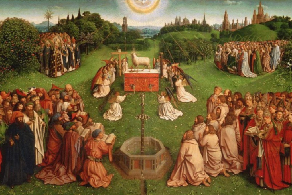 The War brings Clamence to Africa and to a desert prison camp where he winds up elected “Pope” by his fellow prisoners. After the War he comes to Amsterdam. And one night in Mexico City a drunken burglar trades the surly bartender a stolen art masterpiece (van Eyck’s “Just Judges” from his “Adoration of the Lamb”) for a bottle of gin. Clamence gives us several reasons why he persuaded the bartender to give him the painting for safekeeping.