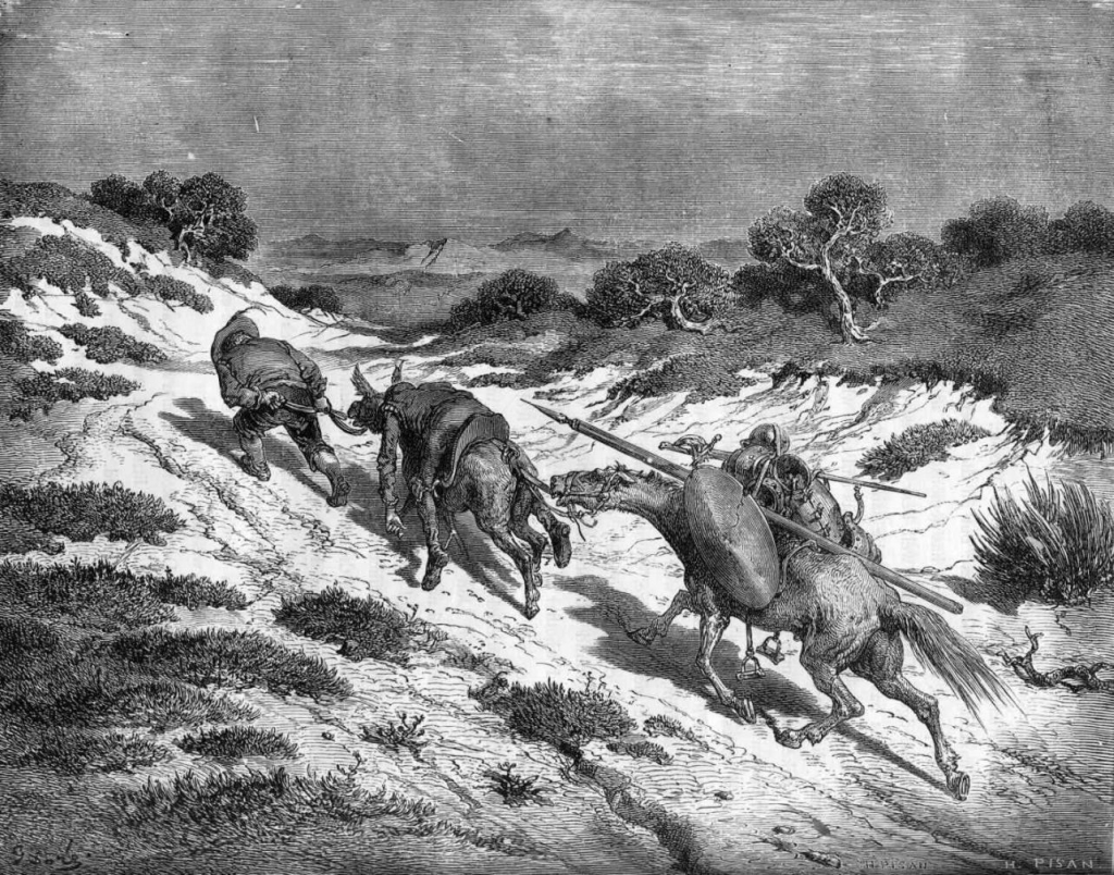 But just as he needs a lady, every knight needs a squire. And so Don Quixote avails himself of the service of a local farm worker named Sancho Panza. Lured by promises of glory (and governorship of an island), Sancho joins his new lord on a series of comic adventures. Sancho is unfamiliar with the chivalric tales that drive Quixote and cannot recognize the illusions which evil enchanters can cast. Where Quixote sees four-armed giants, his simple squire can only see windmills: Quixote’s castles appear to Sancho to be humble inns and Quixote’s magical “balsam of Fierabras” is to Sancho a mix of wine, salt, rosemary and olive oil that leaves him purging from both ends.