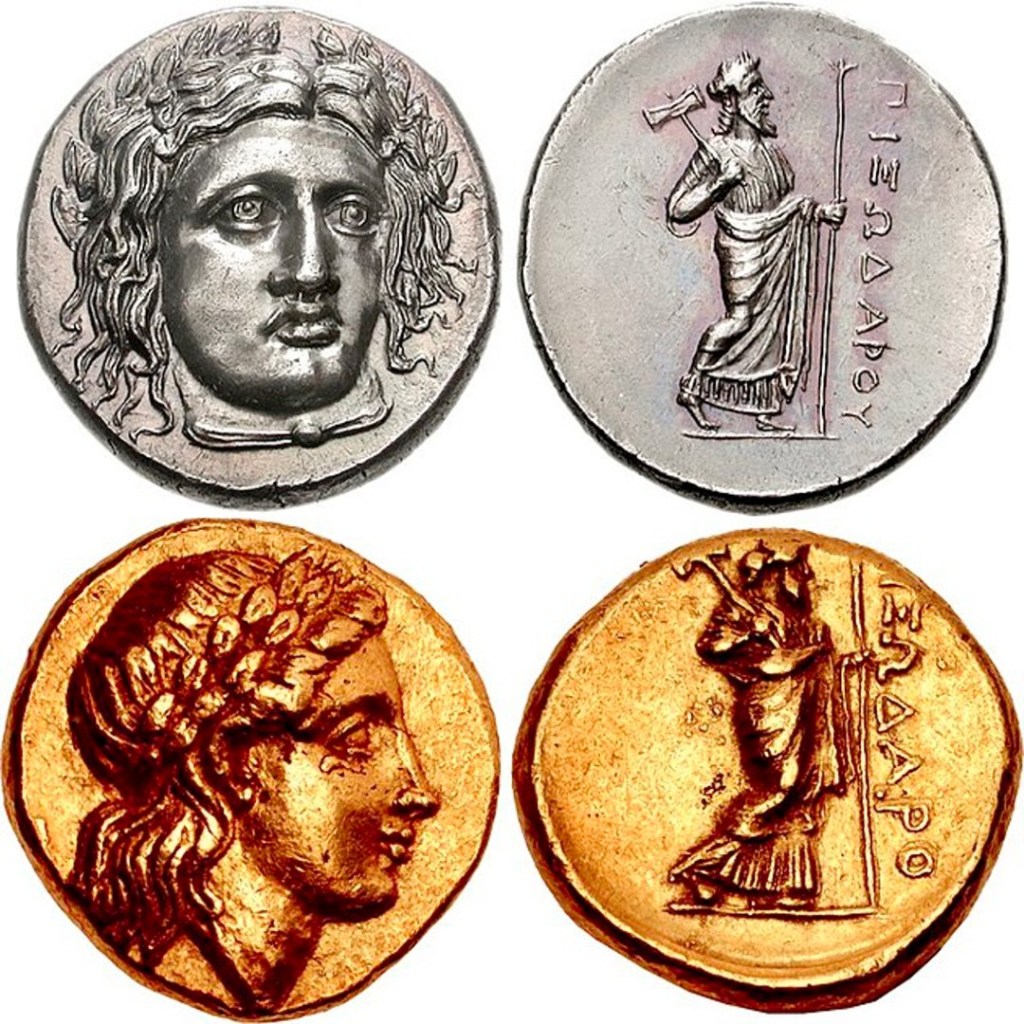 The Carian Zeus pictured above is a Roman reproduction of the statue commissioned by the father of Mausolus, the satrap Hecatomnus (Ktomno in Carian). Hecatomnus moved his government from Halicarnassus to Mylasa upon attaining power (394-390 BC), and restored the temple to Carian Zeus. The reproduction lacks the double-headed axe, or labrys, carried by the Carian Zeus. (You can see it on the obverse of the coins pictured above). The labrys is most often found in the hands of female deities, but the Carians regularly placed it in the hands of their Zeus.